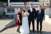 Eine rot und blaue Abordnung hat dem Brautpaar die Grüße und Glückwünsche des SC Holzhausen übermittelt. Vereinsführung und Mitspieler wünschten ein sonniges Eheglück und viel Freude auf dem gemeinsamen Weg!