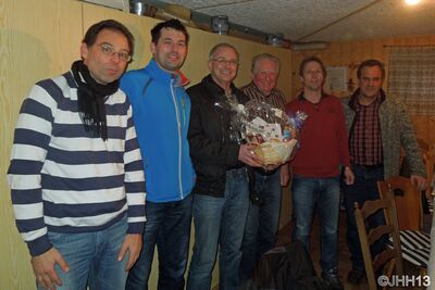 Bild unten: Berthold Krieger für die AH, Bernd Strobel vom Förderverein, Kurt Fehrenbach vom Radfahrverein, der Jubilar, Michael Metzger SC H, Kurt Hettich vom Musikverein.