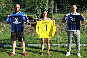 Das Bild zeigt Trainer Gregor Hensler, die glückliche Gewinnerin Sandra Friedmann sowie unseren neuen Trikotsponsor Philipp Grüninger bei der Trikotübergabe.