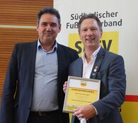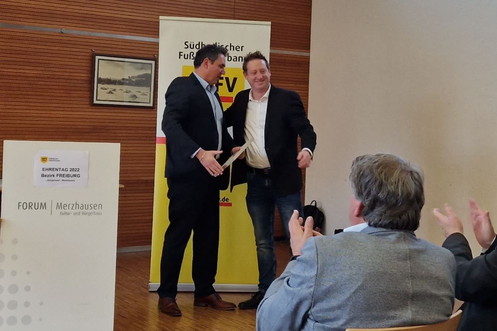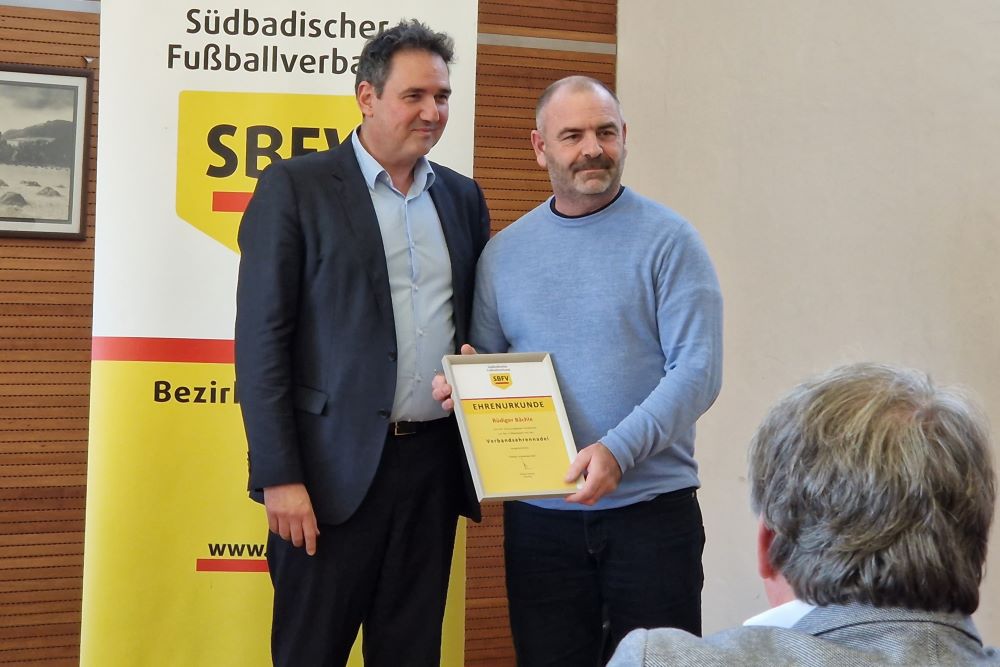 Rüdiger Bächle erhielt die Verbandsehrennadel für seine Tätigkeit als Spielausschuss in Wolfenweiler, zuvor war er 4 Jahre Spielausschuss in Holzhausen. Ebenfalls die Verbandsehrennadel erhielt das Mitglied im Bezirksfussballausschuss Alexander Baumgartner der zusätzlich auch noch als Schiedsrichter tätig ist. Auch Alexander ist seit vielen Jahren mit dem SC Holzhausen freundschaftlich verbunden.