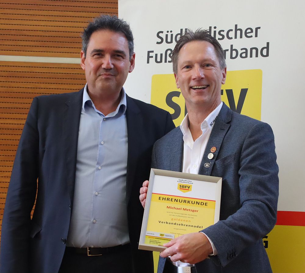 Unser Ehrenvorsitzender Michael Metzger wurde mit der goldenen Verbandsehrennadel ausgezeichnet. Bezirksvorsitzender Arno Heger ging in seiner Laudatio auf die 30-jährige Vorstandstätigkeit von ihm ein. In diesen Jahren wurden große Projekte wie der Kunstrasen und Abwasserleitung realisiert wie unter anderem auch das Bezirkspokalendspiel 2014 durchgeführt. Zuvor war er bereits mehrere Jahre als Jugendtrainer tätig. Viele Jahre war er auch im Vorstand des Fördervereins aktiv.