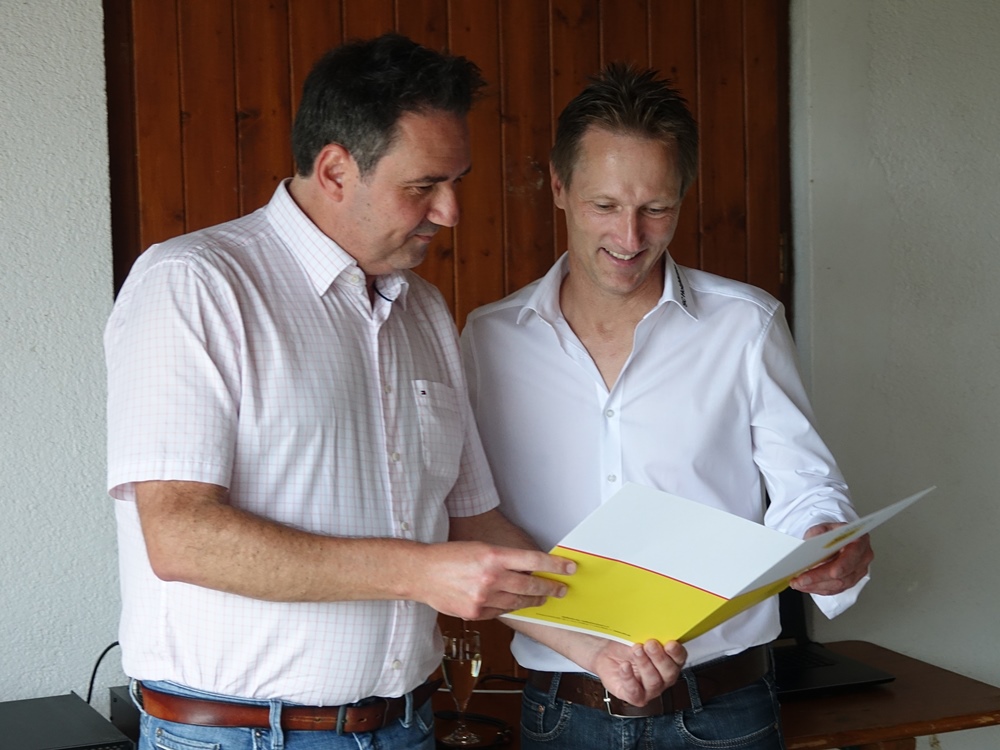 SC H Vorstandsmitglied Christoph Unmüssig und Paul Gutmann vom Musikverein überbrachten die Grüße, Glückwünsche und reichhaltige Präsente. Darunter auch den Originalspielerpass von Klaus aus dem Jahr 1981.