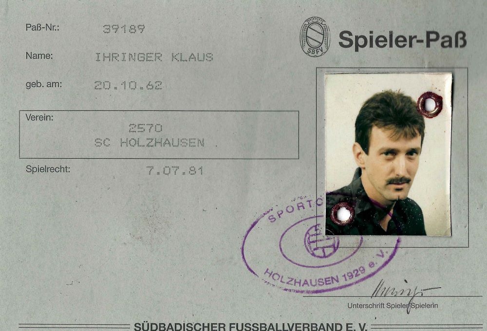 Hier einige Bilder aus der aktiven Zeit von Klaus. Von links: Aktive 1985, Alter Herren 2004, Dorfmeister 2015 und sein Spielerpass aus dem Jahr 1981.