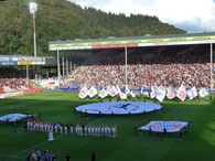 Links auf dem Bild Bernhard mit seinem Nachfolger als Ortsvorsteher Rolf Lorenz bei einem Besuch eines Heimspiels der Aktiven.