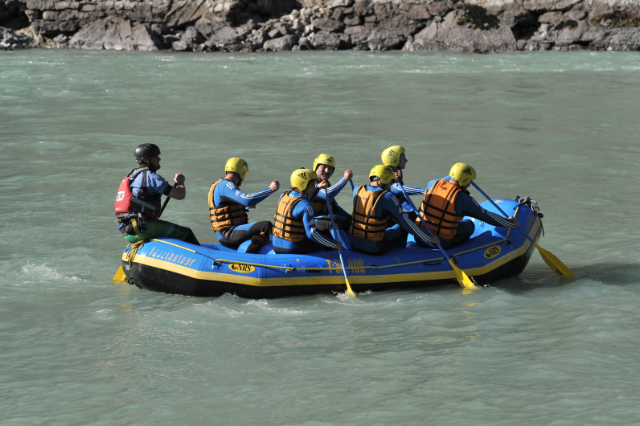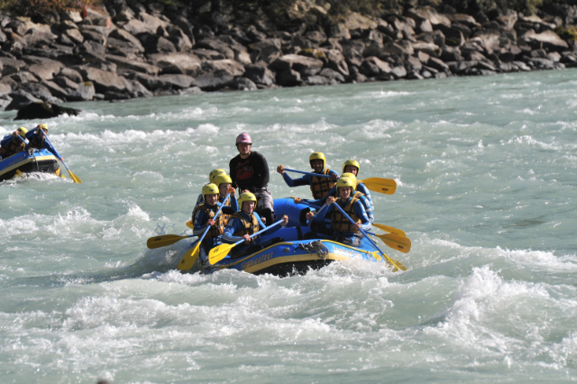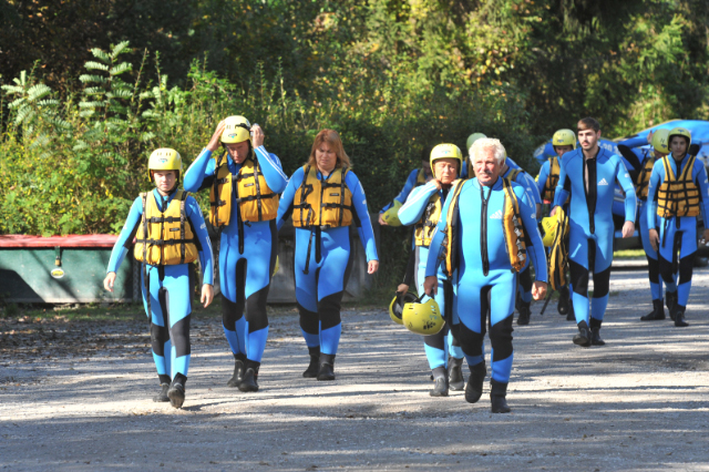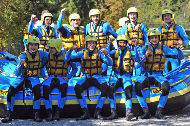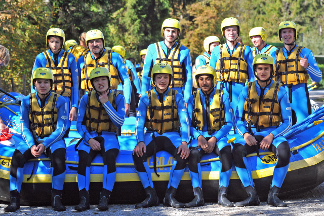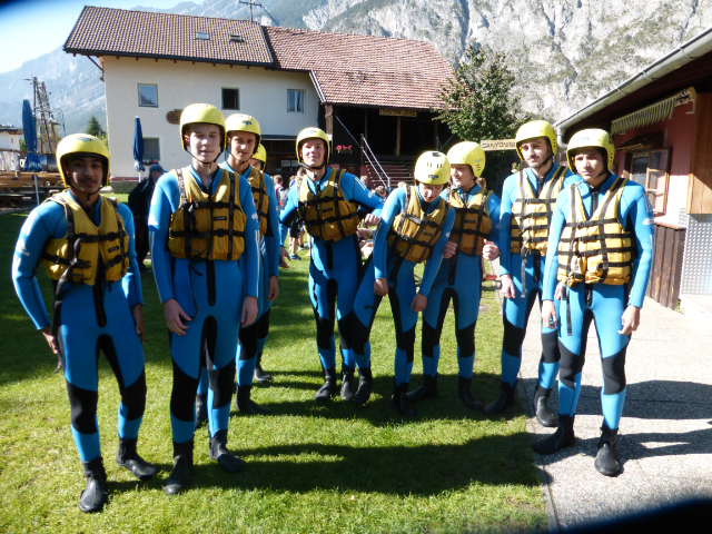 Die B-Jugend belohnte sich selbst für die Papiersammlung Ende September mit einem Actiontag in Tirol am letzten Samstag. Morgens um 7:30 Uhr machte sich die Mannschaft mit Trainer Pascal Thoma und Jürgen Hess auf den Weg nach Haiming, um auf der Imst den Ritt auf der Welle zu proben. Die Jungs wussten nicht was auf sie zukommt, denn zum einen wurde nicht verraten, was genau auf dem Plan steht und zum anderen, weil keiner der Jungs bisher eine Raftingtour gemacht hatte. Pünktlich um 13:00 Uhr ging es dann vor Ort los. Nach knapp 3,5 Stunden auf der nur 7°C kalten Imst kamen alle wohlbehalten, aber geschafft am Ausgangspunkt wieder an. Die Jungs mussten nicht nur Stromschnellen und größere Wellen meistern, nein die staatlich geprüften Bootsführer motivierten alle über die gesamte Strecke von rund 14 km zu allen möglichen Übungen bis hin zum „entspannten Bad“ in der kalten Imst. Nur gut, dass alle bestens ausgestattet waren und die dicken Neoprenanzüge die Kälte draußen hielt. Geschafft und glücklich über das Erlebte kamen wir am Abend wieder nach Holzhausen heim. Gefragt, was sie sagen, wenn die Jungs in wenigen Worten den Tag beschreiben sollen, kam kurz, knapp, aber treffend – geil, einfach geil. Wieder ein Ausflug der, trotz körperlicher Anstrengung viel Spaß gemacht hat und einzigartig war.
