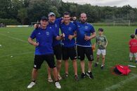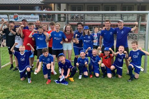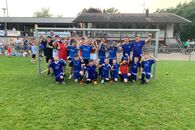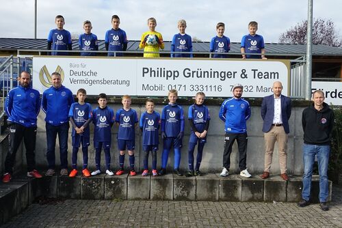 unten von links: Gregor Hensler (Trainer), Thorsten Buschmann (Trainer), Tedislav Oreshenski, Tim Weber, Niklas Kaiser, Claudio Friedmann, Pascal Link, Sophia Buschmann, Kevin Knoll (Trainer), Philipp Grüninger (Trikotsponsor) und Bernd Schrodi (Vorsitzender Förderverein).