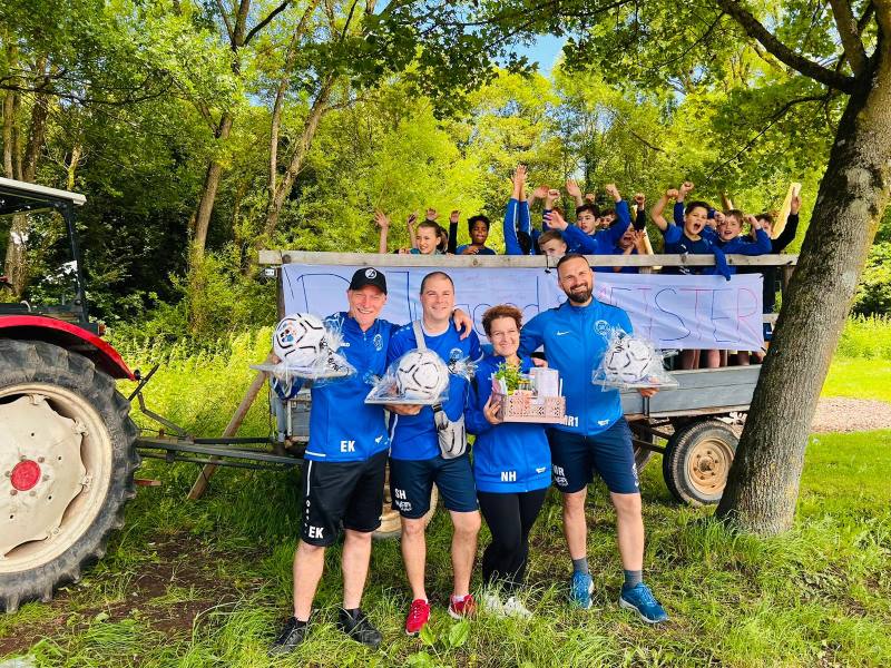 Ihr habt hier echt eine tolle Stimmung!", waren die Worte des gegnerischen Trainers. Und so feierte man gemeinsam mit dem Gegner und vielen Eltern, Großeltern und Geschwister, sowie einigen Mitglieder der Vorstandschaft auf dem Kunstrasen. Danach ging es auf dem Hänger durch das Dorf und man besuchte und feierte mit einigen wichtigen Persönlichkeiten aus dem Verein die gewonnene Meisterschaft. Nach der Rückkehr gab es noch Essen, das von Clubheimwirtin Saskia Prinz gesponsert wurde und Getränken, gesponsert von unseren "Fußballmuttis" um sich wieder zu stärken.
