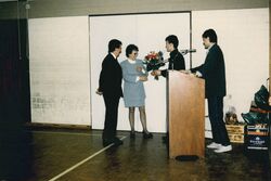 Weihnachtsfeier vermutlich 1991, vermutlich die Spielführer übergeben dem damaligen Trainer Günther Nenninger und seiner Frau ein Präsent. Rechts Rolf Lorenz (II. Mannschaft) Gerhard Kohler (I. Mannschaft). ?? oder Klaus Baumer?
