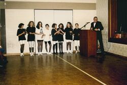 Der damalige Vorsitzende Rolf Senn bedankt sich bei einer Turngruppe.