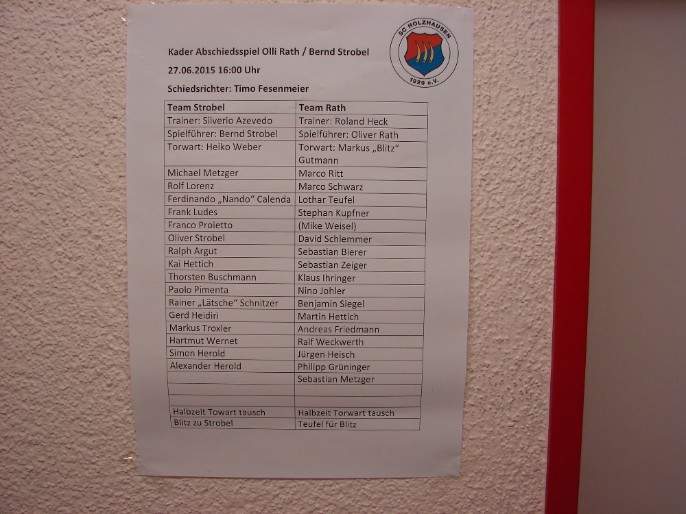 Am Samstag, 27.06.2015 werden die langjährigen Holzhauser Aktiven Spieler Bernd Strobel und Oliver Rath verabschiedet. Zwei Teams der Beiden aus 20 Jahren tritt gegeneinander an. Auf Initiative des aktuellen Spielführers Sebastian Metzger und des stellv. Vorsitzenden Philipp Grüninger sollen beide für ihr jahrzehntelanges ehrenamtliches Engagement, welches deutlich über dem des Hobbyfussballers lag, geehrt und würdig von den Aktiven verabschiedet werden.
