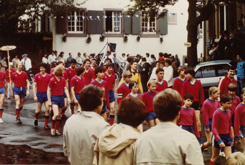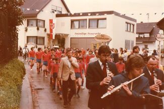 Selbstverständlich nahmen alle Holzhauser Vereine daran teil. Der Zug führte durch das Dorf zum Festgelände. (altes Sportgelände zum heutigen Park- und Inlinerplatz)
