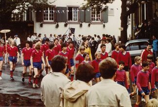 Angeführt wird die SC H Gruppe vom damaligen Vorsitzenden Helmut Krieger, rechts im Anzug mit Vollbart Peter Siebold, in der Reihe der größeren Jugendspieler Adam Auer, Roland Wehrle, Oliver Lingg und Andreas Heidiri.