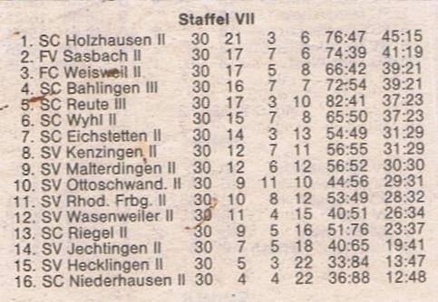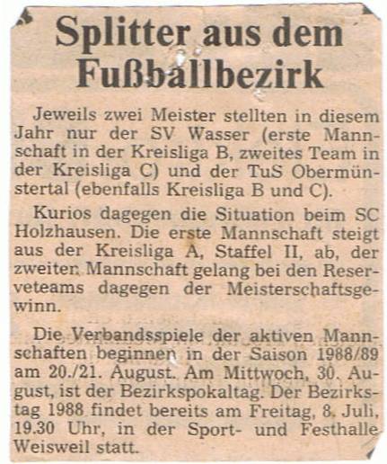Nach der Meisterschaft der I. Mannschaft im Jahr 1986 war man die zweite Saison in der Kreisliga A zu Hause. Rolf Senn übernahm von Helmut Krieger den Vereinsvorsitz. Damals wurde die Generalversammlung im Übrigen noch im Vereinslokal im "Gasthaus zum Löwen" abgehalten.