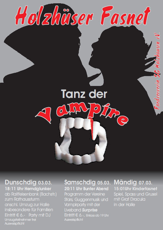 Mit riesigen Schritten kommt die diesjährige Fasnacht auf uns zu. Dieses Jahr unter dem Motto „Tanz der Vampire“ feiern wir 3 lustige Tage in der Festhalle in Holzhausen.
