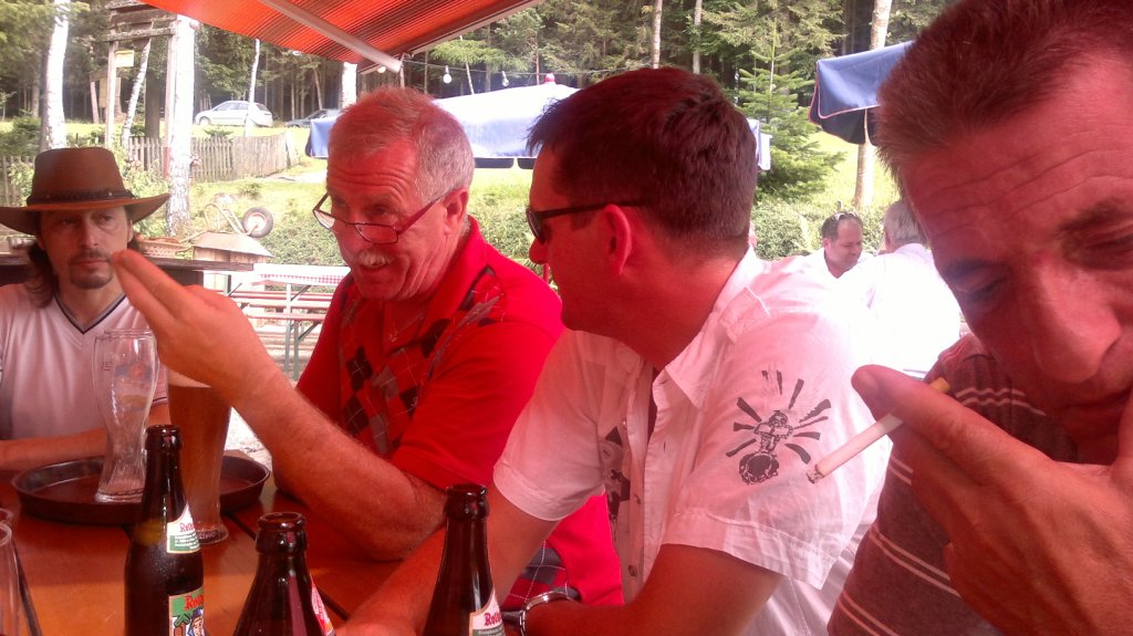 Nach dieser Runde begab man sich dann zum zuvor telefonisch verabredeten Treffpunkt zur Abholung nach Holzhausen. Aber selbst auf dem Weg dorthin gelang es abermals Emmes wieder eine „Löwenbier-Quelle“ ausfindig zu machen und die Truppe wiederholt mit Nachschub zu versorgen, in dem er die Mutter des sportlichen Leiters dazu „nötigte“ ihren Keller-Bierbestand für die „gute Sache zu opfern“. Anschließend fuhr man dann zurück zum Sportheim des SCH wo mit Grillsteaks, Salaten und Pommes und wiederum bei ein paar Bierchen der Tag einen gelungenen Abschluss fand.