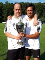 Die Six Pack Boys haben nun nach 2009 und 2015 den 3. Pokalsieg errungen. Deren Mannschaftsführer Marco Ritt und Marco Schwarz (siehe Bild rechts) waren überglücklich beim wohl härtesten Hobby Fussball Turnier erneut den Pokal gewonnen zu haben.