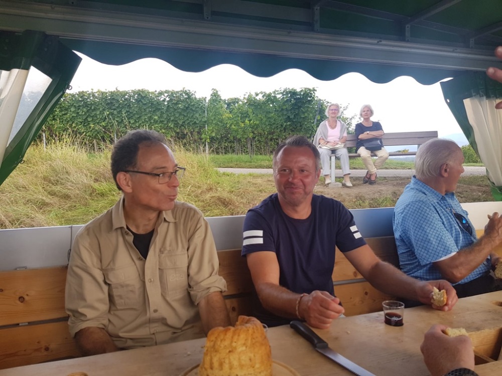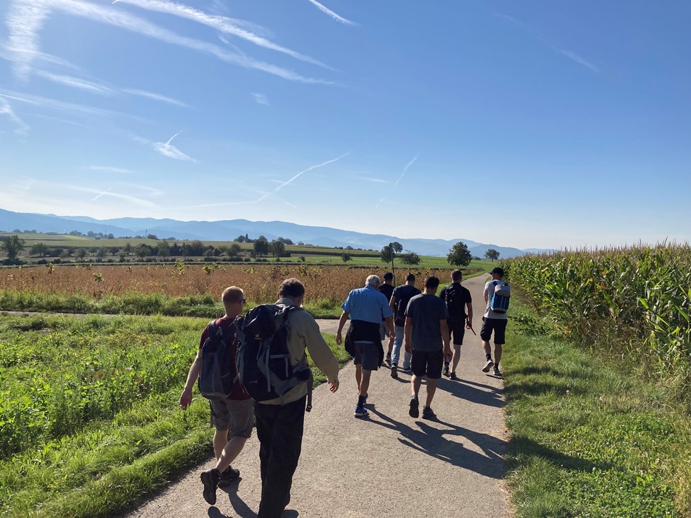 Erstes Etappenziel war Gottenheim, wo wir bei unserem Kameraden Frank Bourquin einen ersten Stopp zur Stärkung einlegten. Die Altersspanne in der Gruppe reichte von 32 bis 70 Jahren.