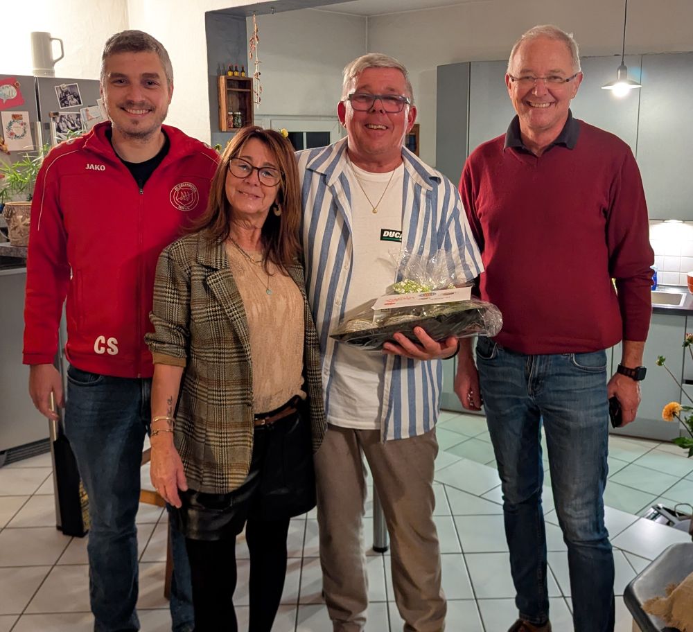 Stellv. Vorstandsvorsitzender Christian Schweizer und der Vorstandsvorsitzende des RV Concordia Kurt Fehrenbach überbrachten die Grüße, Glückwünsche und ein Präsent. Am Geburtstag selber war er mit der Familie verreist. Doch zu einem Geburtstag wurde die Gratulanten trotzdem eingeladen. Nämlich zum Geburtstag seiner Frau Gisela am 22.10.2025. Thomas ist seit 1974 Mitglied des Vereins und Teil der Meistermannschaft 1986. Er engagierte sich mehrere Jahre in der Jugendarbeit des SC Holzhausen. Als Betreiber der Tankstelle in Holzhausen war er auch jahrelanger Sponsor des Fördervereins Holzhausen.
