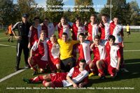 Jetzt wussten alle, der erste Sieg ist greifbar nah. In der Abwehr war man sogar etwas übermotiviert und verursachte auf ungeschickte Art einen Elfmeter. So verkürzte die SG Prechtal kurz vor Ende auf 3:2 und machte so das Spiel in den letzten Minuten noch mal richtig emotional und spannend. Zwei Minuten später pfiff der sehr gut durch das Spiel führende Schiedsrichter, Fabian Rebmann aus Kirchzarten, das Spiel ab und das Unglaubliche war geschafft, wir haben gewonnen, wir sind die Sieger!!! Zum ersten Mal erlebten wir, was es heißt, einen Sieg zu feiern. Ein tolles Gefühl und ich hoffe, es macht allen soviel Spaß und Freude, wie mir, dass wir Gefallen daran finden und Lust auf mehr davon haben.