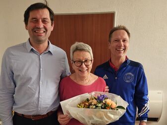 Brigitte Senn konnte in den vergangenen Tagen ihren 75. Geburtstag feiern. Bernd Strobel und Michael Metzger überbrachten die Grüße und Glückwünsche des Vereins verbunden mit einem Blumengruß.