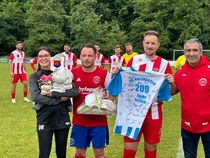 Helmut Hettich, Platzwart des SC Holzhausen wurde ebenfalls geehrt. Helmut kümmert sich um den Rasen- und Kunstrasenplatz. Er ist ein wichtiger Bestandteil des Erfolgs unserer Teams. Irma Hettich erhielt ebenfalls warme Dankesworte von Moritz. Sie sorgt Woche für Woche dafür, dass die Spieler in frischgewaschenen Trikots auflaufen können. Irma und Helmut, danke euch für eure tolle Arbeit. Ihr seid wahrlich SC Holzhausen Legenden.