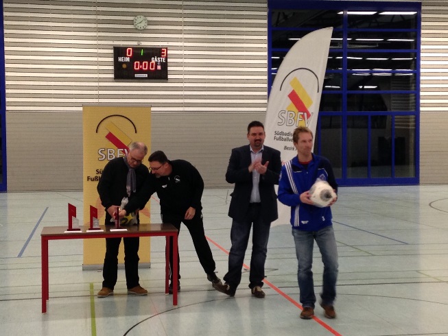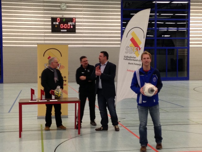 Aus den Händen des Bezirksvorsitzenden Arno Heger konnten die Siegermannschaften die neu geschaffenen Pokale sowie einen Geldpreis des Medienpartners SüdbadensDoppelpass entgegennehmen. Lob gab es vom Bezirkspressewart Peter Welz auch an den Vorsitzenden Michael Metzger vomAusrichter SC Holzhausen, der es wiederum verstand, mit seinem Team einen reibungslosen Ablauf des Turniers zu gewährleisten. Die SF Eintracht Freiburg wird den Bezirk Freiburg bei den Südbadischen Futsal-Meisterschaften in Gengenbach am 22.02.2105 vertreten.