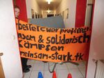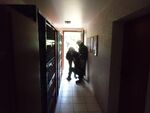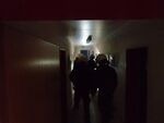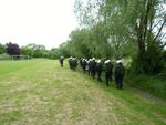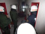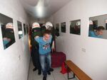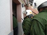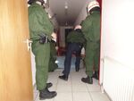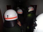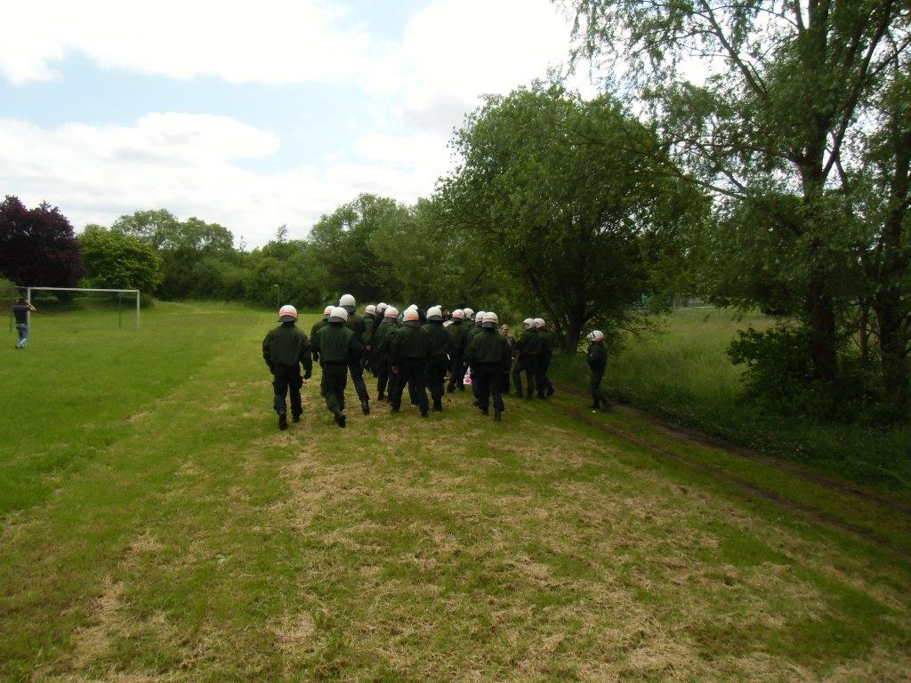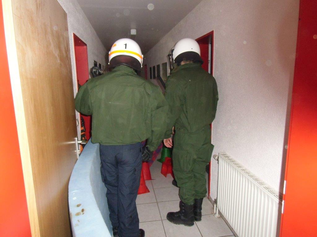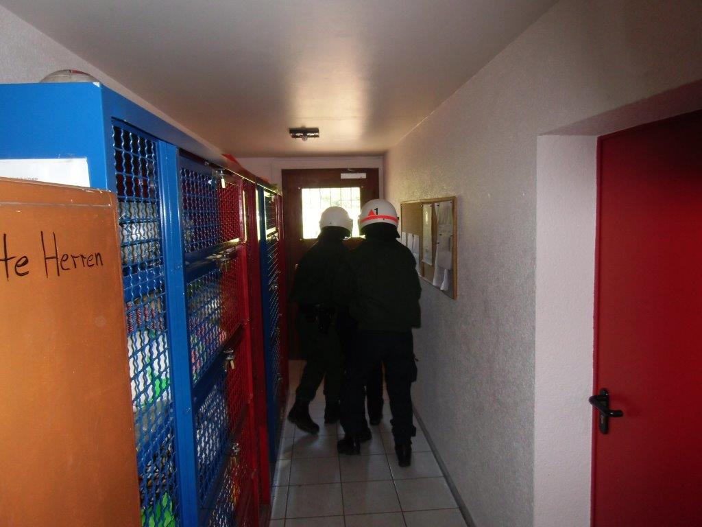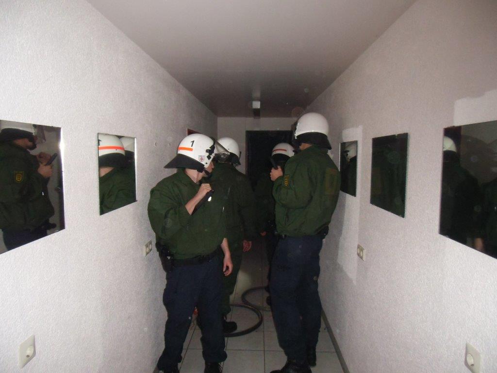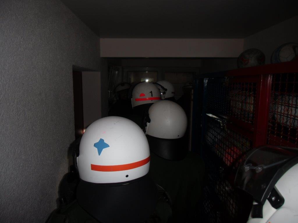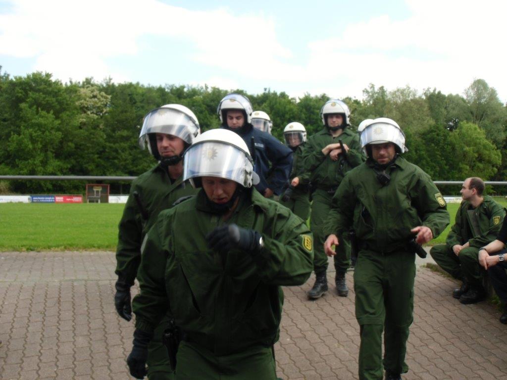 Nachdem am Vormittag in der Buchheimer Sporthalle ein "Belastungs-Parcours" durchgeführt worden war, folgte am Nachmittag eine Übungseinheit auf dem Sportgelände des SC Holzhausen. Hierbei galt es zunächst eine kleine "Störergruppe" festzunehmen und in einer weiteren Sequenz wurde das "besetzte Sportheim" (in diesem Fall nur der Bereich der Umkleidekabinen) durch die Einsatzkräfte durchsucht und die "Hausbesetzer" festgenommen und abtransportiert. Erschwert wurde dieser Einsatz durch diverse Barrikaden, Verdunkelung und Lärm.