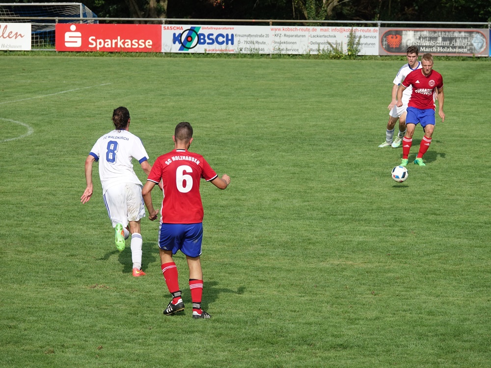 In einer ausgeglichenen ersten Halbzeit sahen die Zuschauer clever agierende Gäste, die früh durch einen direkten Freistoß in Führung gingen. Der SC Holzhausen erspielte sich durch gute Spielzüge zwar die eine oder andere Torchance, agierte aber vor dem Tor dann hektisch und umständlich. Unnötige Ballverluste und zu langsames Umschalten ermöglichten den Gästen immer wieder gefährliche Aktionen. Durch einen schnell ausgeführten Konter erhöhte der SV Waldkirch zum 2:0 Zwischenstand.