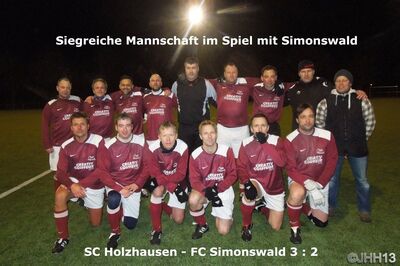 Am Freitagabend, 15.03.13, nahm die AH Mannschaft des SCH erfolgreich Revanche für die deftige Niederlage im Hinspiel (0:4) in Simonswald. In der ersten Hälfte war die Partie völlig ausgeglichen und beide Mannschaften stellten die Absicherung des eigenen Tores erst einmal in den Vordergrund. Simonswald, das aus einer starken Abwehr heraus zunächst mit schnell vorgetragenen Kontern sein Glück versuchte, verbuchte in der ersten Hälfte die Beste und zugleich einzige richtige Torchance bis zum Pausenpfiff mit einem Kopfball an den Außenpfosten.