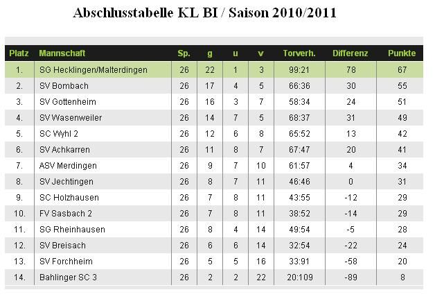 Tabelle Kreisliga B Staffel I 2010 / 2011