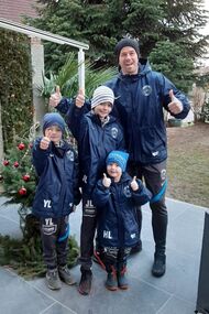 Hier im Bild Jan Landerer mit seinen 3 Fussballern und den neuen Regenjacken, damit Training bei "Wind und Wetter" möglich ist.