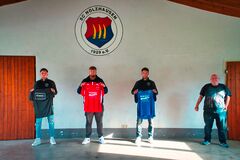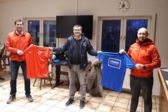 Hier im Bild Jan Landerer mit seinen 3 Fussballern und den neuen Regenjacken, damit Training bei "Wind und Wetter" möglich ist.