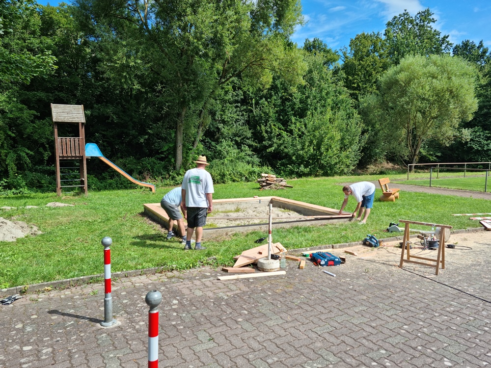 Organisiert von Hermann Gebhard wurde das Holz für die Sitzflächen am Sandkasten von Michael Gutmann und Oli Rath angebracht – Vielen Dank für Euren Einsatz.